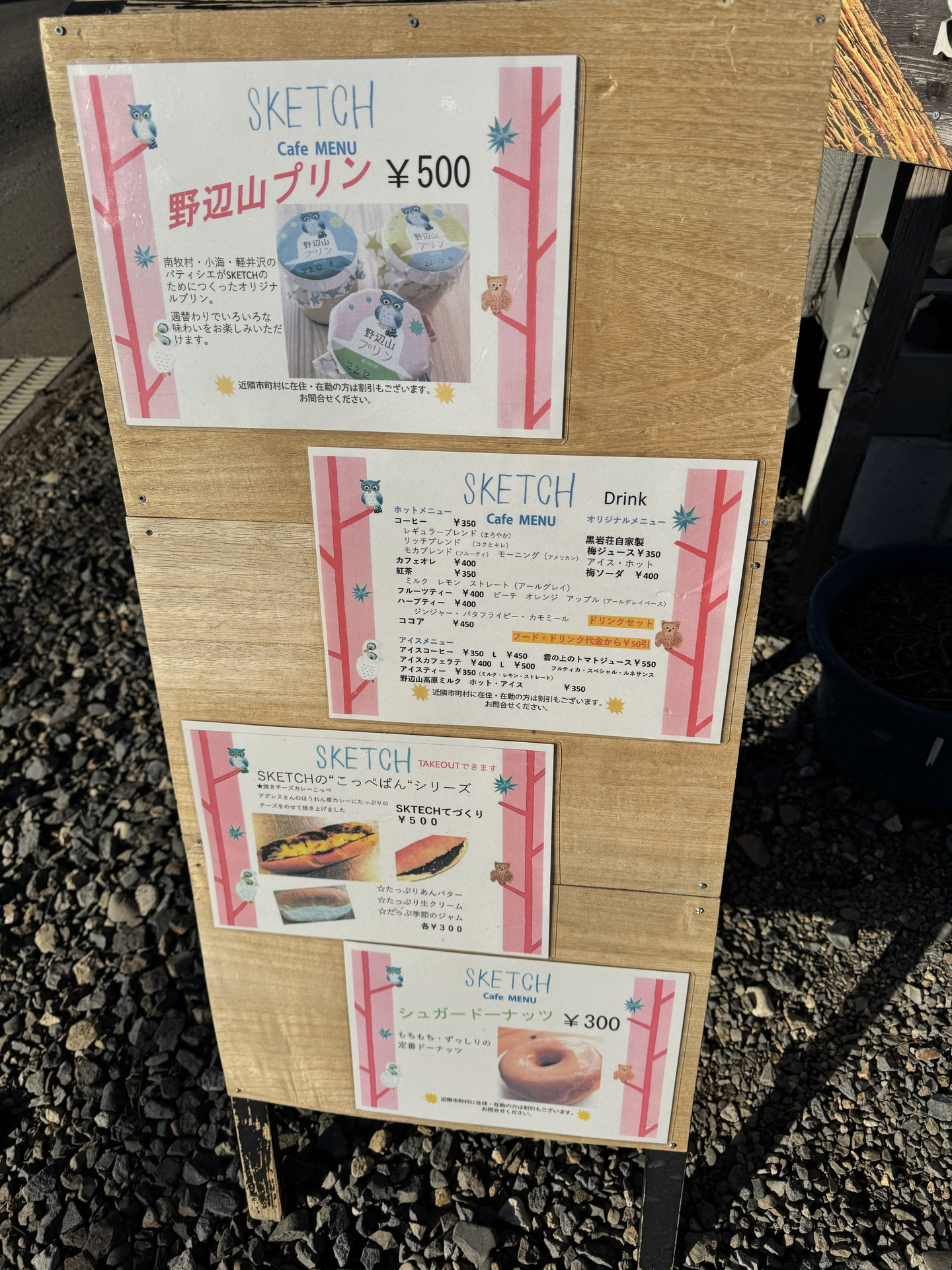 野辺山のカフェや茅野のうなぎ屋など 2026.02.262026.03.12 読み上げ開始読み上げ停止 野辺山駅の近くを歩いていたら、カフェがありましたので、コーヒーを飲んできました♪ カフェスケッチ メニュー看板 中にはおしゃれなイラストがたくさんあり楽しい空間。同じ画家の絵や絵本などが展示販売されています。この画家のファンが遠くから見にやってくるとのこと。 カップもいろいろなデザイン! 別の日には茅野駅の前を通りかかりましたので、うなぎを食べてきました!(^^)! きました~ おいしそ~ ある日の夕焼け 夕焼けと木のシルエット